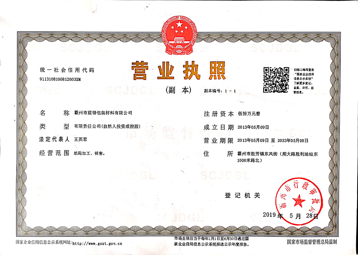 霸州市藍鋒包裝材料有限公司,前身為成立于1988年的勝芳鎮藍劍紙箱廠。是河北省較早涉足紙包裝制品的民營企業。經過近三十年的發(fā)展,公司已經由起初的家庭作坊發(fā)展為現有標準化廠房8000平米,員工50人,其中管理人員7名;年產紙箱上億平米的現代化企業。